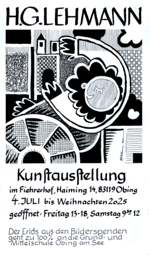 Unsere diesjährige Kunst-Ausstellung mit gespendeten Bildern von H.G. Lehmann läuft zu den üblichen Öffnungszeiten im Fiehrerhof. Der Reinerlös wird der Grund und Mittelschule Obing zu Gute kommen.
